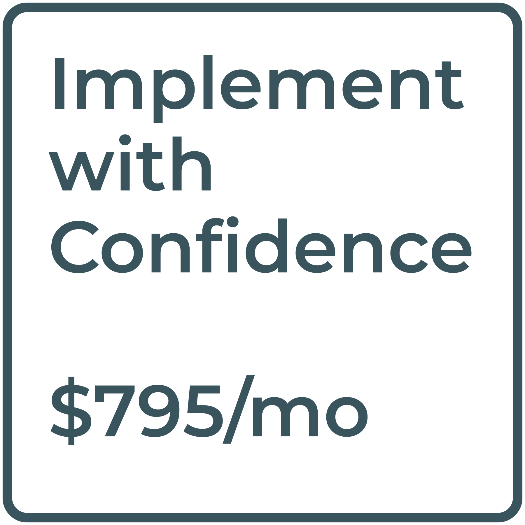 Implement with Confidence provides the ongoing guidance your team needs to protect that investment. With steady review and alignment check-ins, your message stays sharp, your team stays focused, and the work you created becomes a lasting part of how your company communicates.Includes weekly check-ins for content review, alignment support, and access for messaging questions.